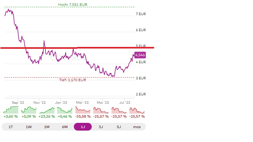 Na ja, und irgendwie merkt man's auch am Kurs. Seit Börsenbeginn bei rund 6,20 € waren wir neuerdings fast um 50 % abgetaucht. Im Plus waren wir nur ganz kurz. Angesichts der tatsächlich auf dei Straße gebrachten Fahrzeuge ist das kein Wunder. Es gibt mometan bessere Autowerte als Volvo-Cars.