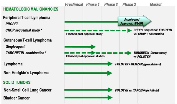 The brokerage said while there was lesser risk in getting Folotyn approved as a treatment for a kind of cancer, peripheral T-Cell lymphoma (PTCL), there were "several free call options in the pipeline." Folotyn, which received an accelerated approval to treat PTCL in September 2009, is being tested in two other types of cancer -- cutaneous T cell lymphoma and non-small cell lung cancer (NSCLC).