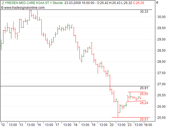 Schau Dir mal das straffe nach oben springen von heute an - gerade mal 0,37 EUR oder 1,42 %. Und weiter - an der Kurseinschätzung hat sich auch heute nicht viel geändert. Die FMC ist nach wie vor im kurzfristigen Baisse-Bereich, also von straffem nach oben ziehen des Kurses keine Spur.