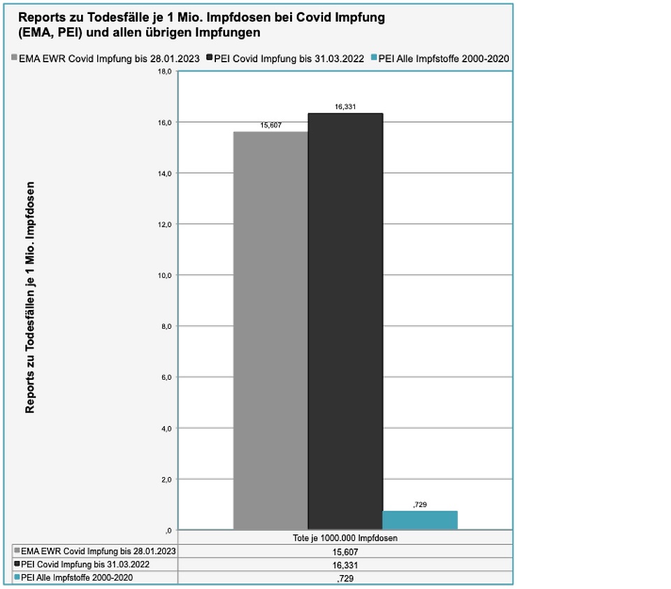 Diese Zahlen gehen aus den Datensätzen vom 28.01.23 der Gruppe Impfnebenwirkungen.net hervor. Diese Gruppe wertet seit Beginn der Covid Impfung systematisch die an die EMA gemeldeten Verdachtsfälle auf Grundlage der EMA Rohdaten und ADR Reports aus.