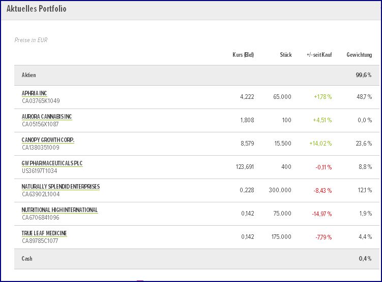 "Eine Mindestgewichtung eines Wertes am Wikifolio soll es nicht geben. Es könnte vorkommen, dass in diesem Wikifolio etwa 100% in ein einzelnes Papier investiert werden. Das "Cannabis & Cannabinoids Industry" - Wikifolio könnte daher als **hochspekulativ* angesehen werden! Die Cashquote soll künftig ca. 0% - 5% betragen. Es wird beabsichtigt etwa 1 - 2, maximal höchstens bis ca. 5 Positionen aufzunehmen. Verluste sollten möglichst klein gehalten werden, können aber nicht von vornherein ausgeschlossen werden! Da nach wie vor nicht alle Unwegsamkeiten und Fragen zur endgültigen Regulierung im Hinblick auf die Verwendung von Cannabinoiden geklärt sind, könnte ein Investment in Aktien/Titel solcher Unternehmen weiterhin mit hohem Risiko behaftet sein und sehr starken Schwankungen unterliegen...." ENDE Zitat