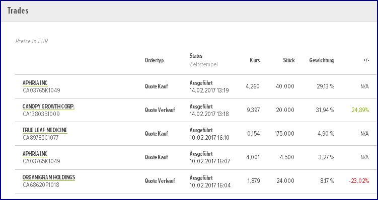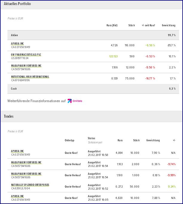 ..im Hinblick auf den Anfang Mai erfolgenden Segmentwechsel habe ich heute zum Kurs von €3,963 , 20.000 Stk Aphria ( http://www.ariva.de/aphria-aktie) aufgenommen, hierfür wurden 9500 Stk CGC aka WEED mit knapp +12% verkauft...