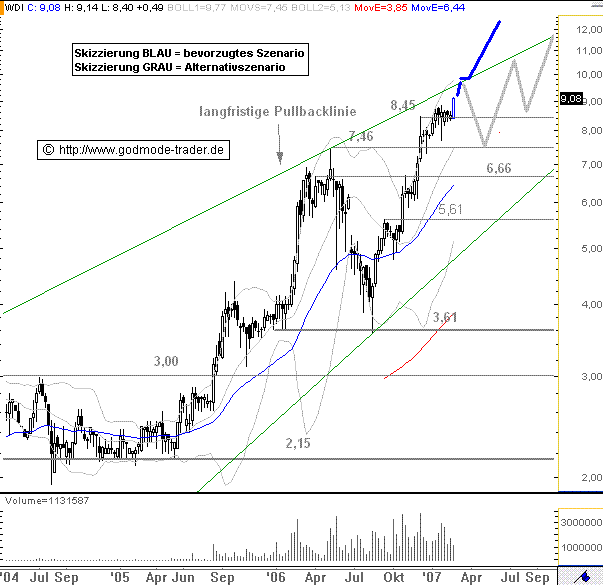 Rückblick: Die WIRE CARD Aktie (Nachrichten/Aktienkurs) erreichte Anfang Dezember ein Hoch bei 8,45 Euro. Seitdem pendelt die Aktie um dieses Hoch. In der laufenden Woche setzt sich die Aktie erstmals deutlicher nach oben ab. Bei 9,47 Euro liegt aktuell die langfristige Pullbacklinie. Allerdings ist sie bisher nicht sonderlich stark definiert. Daher gibt es durchaus eine Chance auf einen Durchbruch.