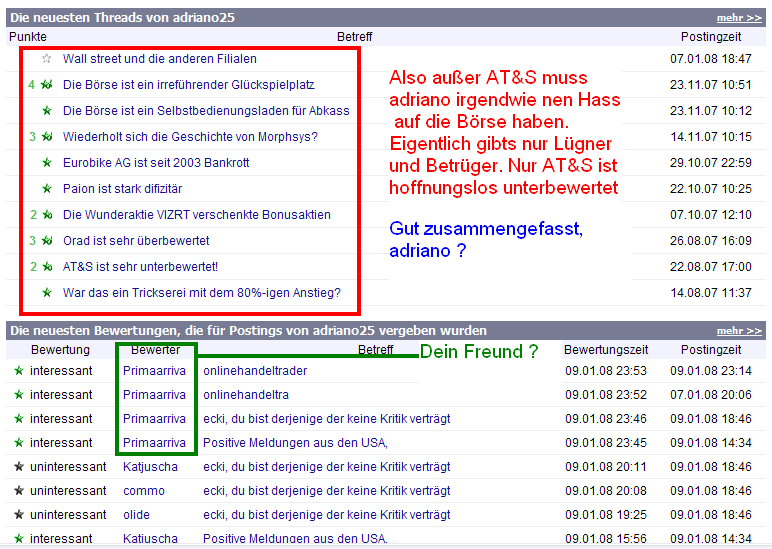 adriano kann man eigentlich nur noch persönlich treffen. Der Typ hat einfach keine Ahnung. Und sowas traut sich an die Börse. Wobei er ja scheinbar nur noch 500 € übrig hat, nachdem er alles bei Amitelo versenkt hat, und die 500 € hat er in AT&S investiert.