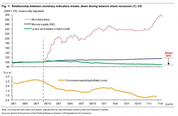 '..Many talk as if banks can "lend out" their reserves, raising concerns that massive excess reserves created by QE could fuel runaway credit creation and inflation in the future. But banks cannot lend their reserves directly to commercial borrowers, so this concern is misplaced.