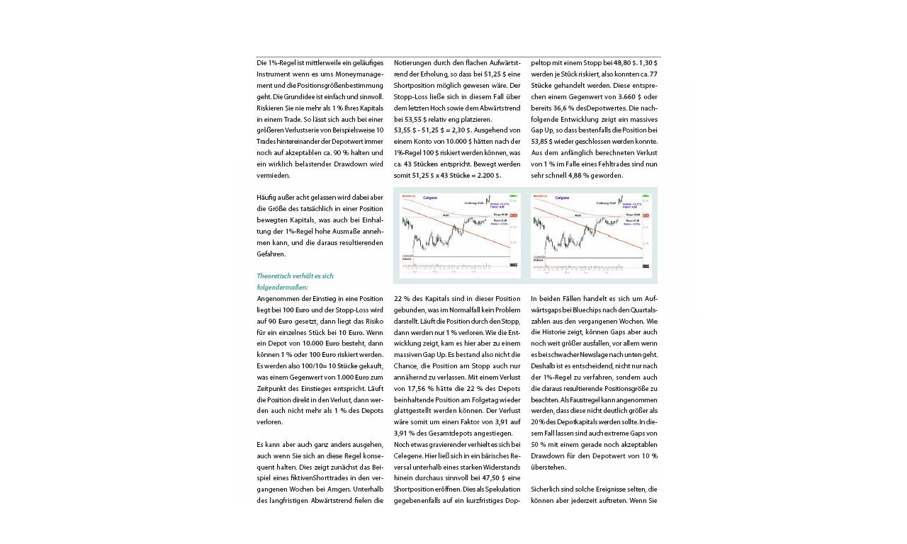 Die letzte Kolumne haben wir zum Start dieser Serie dem Stop Loss gewidmet. Und dabei dargelegt, dass ein optimal eingesetzter Stoppkurs Kapitalerhalt nicht nur überhaupt erst ermöglicht, sondern auch ungemein zum Tradingerfolg allgemein beiträgt, vor allem als Grundlage zur flexiblen Positionsgrößenbestimmung.