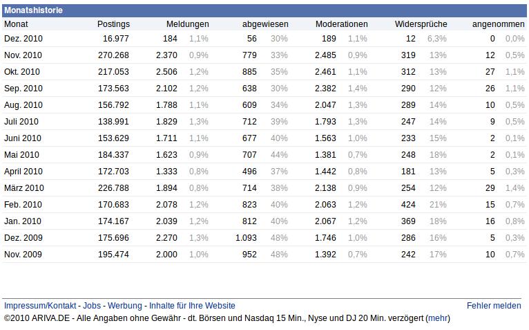 Juni 2009 157.267 2.074 1,3% 767 37% 1.809 1,2% 282 16% 17 0,9% Mai 2009 143.056 1.636 1,1% 569 35% 1.567 1,1% 205 13% 5 0,3% April 2009 131.414 1.587 1,2% 673 42% 1.739 1,3% 283 16% 16 0,9% März 2009 135.275 1.283 0,9% 472 37% 1.422 1,1% 196 14% 4 0,3% Feb. 2009 119.979 1.945 1,6% 626 32% 1.989 1,7% 327 16% 28 1,4% Jan. 2009 137.942 1.873 1,4% 657 35% 1.878 1,4% 363 19% 26 1,4% Dez. 2008 104.415 1.179 1,1% 517 44% 1.310 1,3% 231 18% 36 2,7% Nov. 2008 221.690 1.148 0,5% 487 42% 1.007 0,5% 215 21% 26 2,6% Okt. 2008 139.958 787 0,6% 350 44% 653 0,5% 83 13% 6 0,9% Sep. 2008 119.743 1.197 1,0% 516 43% 1.227 1,0% 161 13% 15 1,2% Aug. 2008 96.875 |