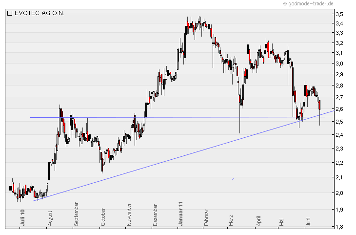 Evotec hält sich im Moment über der Linie die auf 2,60€ zuhält. darunter ergibt sich der Widerstand bei ~2,53€, der sich bereits als Widerstand bestätigt hat. Alles weitere wird sich weisen.