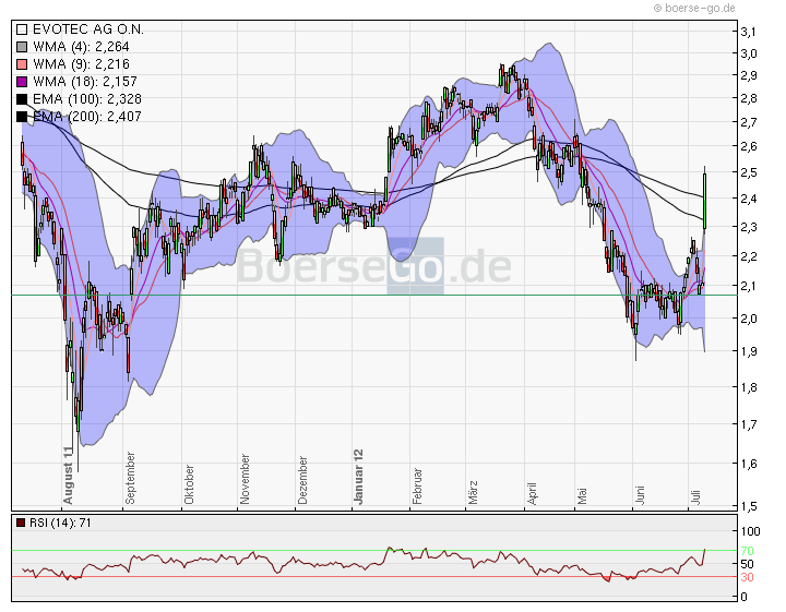 Nach 1-2-3 haben wir bereits heute einen AUfwärtstrend präsentiert bekommen. Maßgeblich war der Bruch zum SK über 2,26. Zudem ist der deutliche Ausbruch aus dem Bollinger inkl. dortigem Schlusskurs als auch der extrem deutliche Bruch der EMA 100 + 200 äußerst bullish zu werten. Zu guter letzt wurde auch in den dreifach gleitenden Durchschnitten bei SK über 2,157 ein Kaufsignal generiert. EVO wird wohl in den nächsten Tagen noch einmal den Bereich 2,32-240 von oben testen. Einzigen Wehmutstropfen sehe ich beim oberen Extrembereich des RSI. Hier könnten Sie shorties langsam wieder positioniert haben. Das unter uns befindliche Gap ist ärgerlich, könnte jedoch als Ausbruchsgap gewertet werden. Diese Schlussfolgerung kann aber erst der weitere Handel der nächsten Tage liefern.