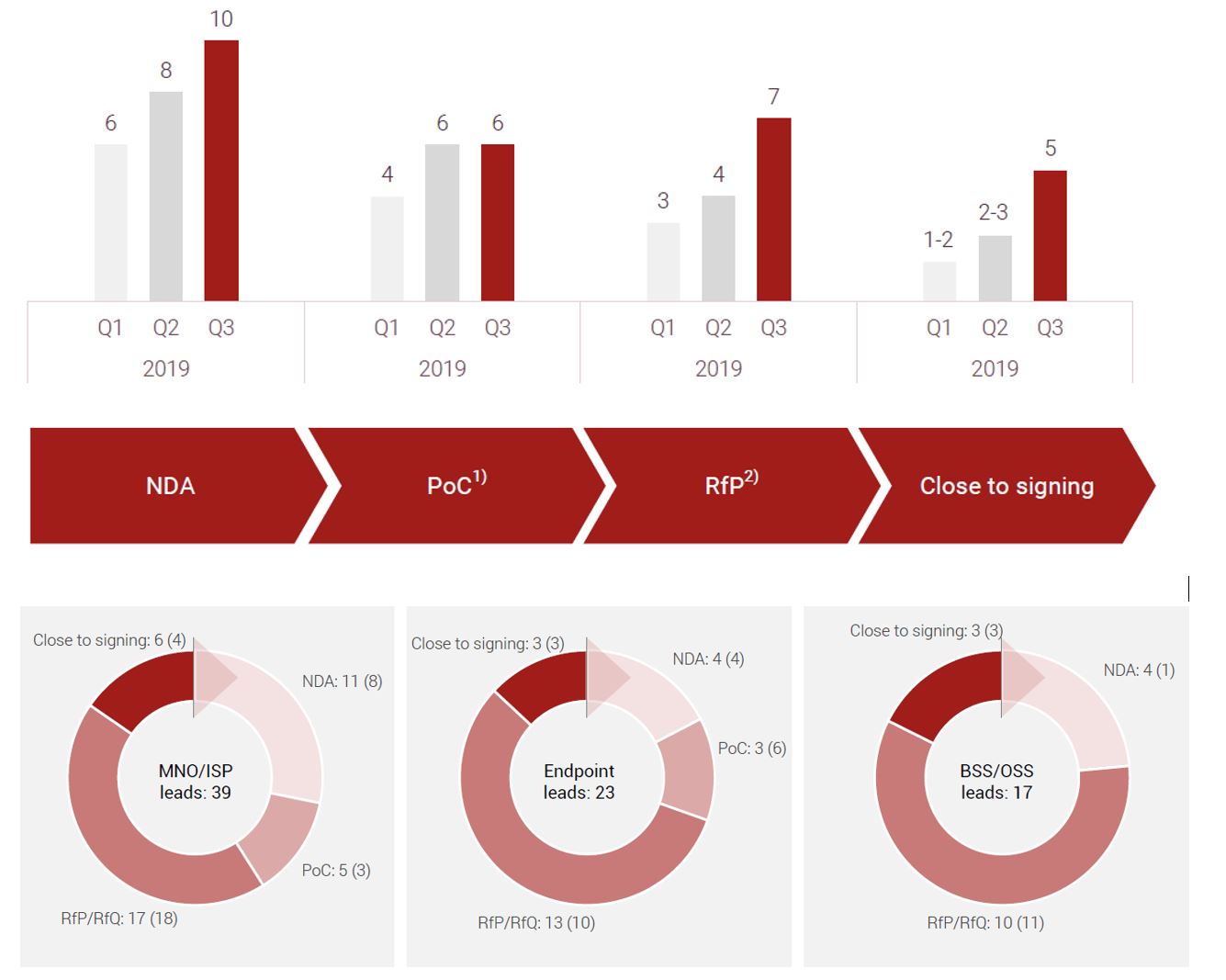 Vergleich der Pipeline vor einem Jahr mit heute. Die Zahl der Leads in fortgeschrittenen Stadium (RfP, PoC, close to signing) ist von 18 auf 60 angewachsen. Da ja auch oft kritisiert wird, dass diese Lead-Pipeline nicht viel aussagen würde, lohnt evtl. eine Überlegung, was mit den 5 Leads "close to signing" aus August 2019 passiert ist. Mit hoher Sicherheit war Telecom Argentina in diesem Status. Ist aus bekannten Gründen (insb. Staatskrise, Hyperinflation) nicht zustande gekommen. Die restlichen könnten sich zusammensetzen aus ACN/Flash Mobile, Wirecard, Aon (falls der Start der App innerhalb der Koopertionsvereinbarung noch eines zusätzlichen Vertrages bedurfte, wovon ich ausgehe wegen dem revenue-share-agreement). Außerdem kommen noch Skitto (die hatten einen größeren Lizenzblock erworben, aber kein Upfront-Lizenzdeal), FiBank und MobiFone infrage. Womit ich hier jetzt richtig liege, kann ich natürlich nicht mit Sicherheit sagen. Und natürlich zeigt das Beispiel Telecom Argentina, dass close to signing nicht gleichbedeutend mit einem sicheren Vertragsabschluss ist, aber ein Blick auf die Leads-Pipeline könnte sich dennoch lohnen, wenn man sieht, dass doch einiges umgesetzt wurde. Bei aktuell 12x close to signing wird es natürlich spannend, was trotz Corona erfolgreich zum Abschluss gebracht werden kann. |
