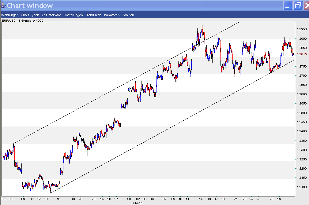 Zum Abschluss noch den langfristigen Euro/Dollar Chart dazu. Der Aufwärtstrend ist vollkommen intakt, die untere Trendlinie hat genau gehalten, bis zu Mittellinie ist eigentlich auf jeden Fall noch Platz....