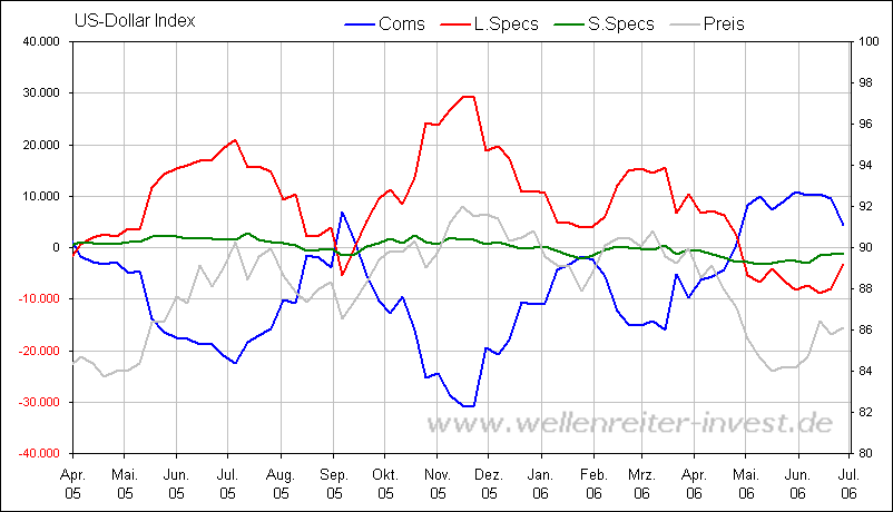 Die Gegenbewegung im Tageschart dauert nun bereits 7 Handelstage an und bisher wurde nicht einmal der Tagesverlust vom 13. Juni 2006 wieder aufgeholt. Die Unterkante der aktuellen Bärenflagge sollte aufmerksam beobachtet werden. Kommt nach einem Bruch erneute Abwärtsdynamik auf, sollten neue - und dann vielleicht tragfähigere und "endgültige" - Tiefs erreicht werden. Beachten Se auch: Der kurzfristige Abwärtstrend wird ebenfalls bereits seit zwei Tagen attackiert. Ein Bruch würde den Weg bis über 600 USD ebnen.