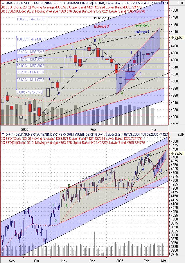 Also wer jetzt noch in Shorts steckt (ich bspw. *grrrrrr*) sollte bei 4.390 den Ausstieg suchen. Die Frage ist jetzt, ob die blaue 3 schon zu Ende ist und nur noch eine kurze 4+5 folgt. Dann wäre die grüne 5 auch am Ende und wir könnten nach unten durchsacken. WEnn wir das Gap bei 4.306 in der laufenden Zählung noch schließen wollen, sollte die rote 3 auch bald am Ende sein weil sonst der Trendkanal über das Gap rutscht.
