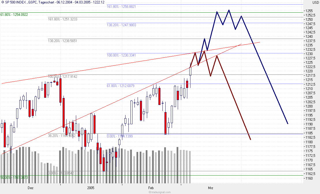 Daraus schließe ich, dass der SPX, sobald er den Bereich 1222-1230 überwindet, sehr wahrsch. bis zum 62er RT also ca. 1254 rasen wird. Falls nicht, steht mehr oder weniger unmittelbar wieder die 1185 auf der Matte.