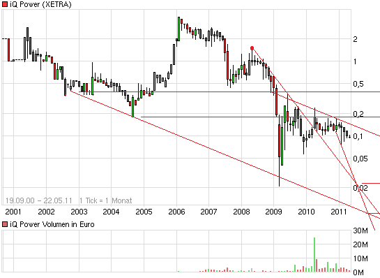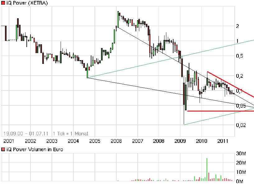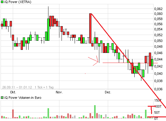 iq power befand sich in der formation eines absinkenden dreiecks. diese formation wurde anfang august zum ersten mal nach unten durchbrochen. den dezember über befand sich der kurs unterhalb dieser formation. der letzte anstieg ist der versuch diese formation nach oben zu durchbrechen. dieser versuch wird meines erachtens misslingen, da er schon kläglich ende dezember gescheitert ist. ausserdem befindet sich der ausbruchversuch so ziemlich am ende der formation. ein zweiter versuch könnte in kürze unternommen werden. sollte dieser versuch wieder misslingen, wird es wahrscheinlich zu einer neuen formationsbildung nämlich die eines ansteigenen dreiecks kommen. das kurstief oder der formationsbeginn dürfte allerdings erheblich tiefer liegen als der jetzige kurs.