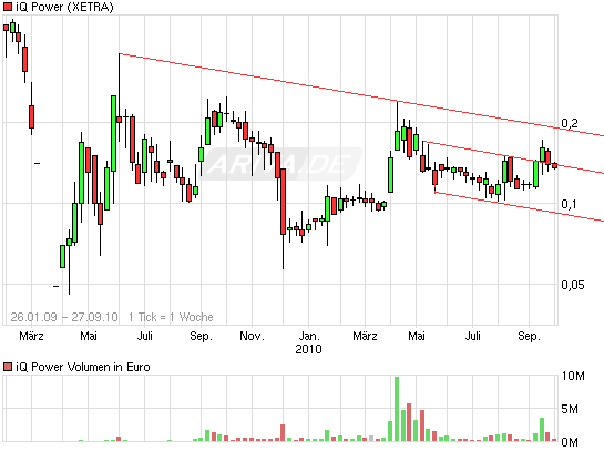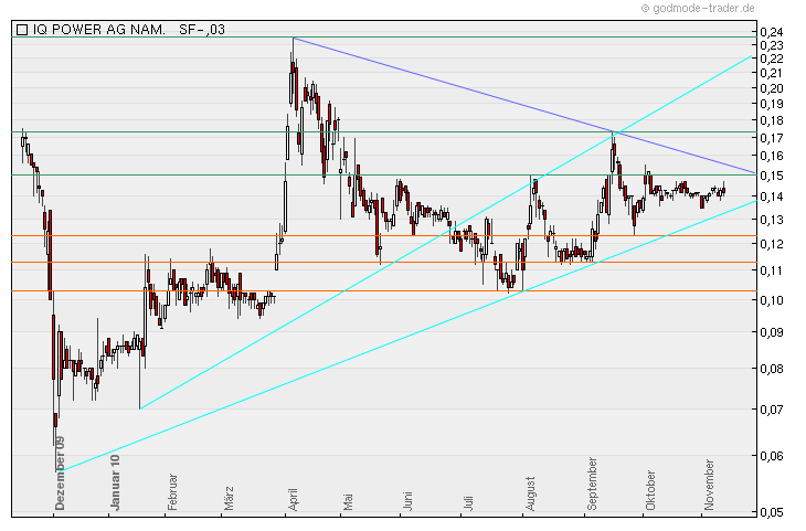 Mögliche Scenarien: a: Das zusammenfallende Dreieck wird nach unten durchbrochen: Allgemein sollte man nach psychologische sowie charttechnisch markanten Stellen Ausschau halten. Hierzu zählen meiner Meinung nach die rot eingezeichneten Unterstützungslinien. Vielleicht prallt der Kurs schon bei 0,123 wieder ab, oder erst bei 0,113... Tiefer als die 0,103 wird es wohl kaum gehen. Wird auch diese Unterstützung nach unten durchbrochen befindet sich die Aktie im freien Fall!