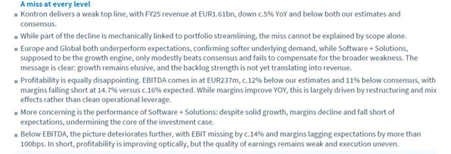 Dies ist ein Ausschnitt aus der Analyse von Kepler, die für mich in Bezug auf FY 2025 alles perfekt zusammenfasst. Was mich darüber hinaus ärgert/enttäuscht ist die Tatsache, dass für das adj EBITDA 2025 auch neben dem jumpec Ergebnis auch Aufwendungen aus dem "realignment" gebucht wurden (s Seite 2 des GB 2025). Der Umsatz im Q4 lag bei 425 Mio (EBITDA bei rd 72 Mio - nach realignment - sohin eine EBITDA-Marge von 17% - nicht realistisch und ehrlich).