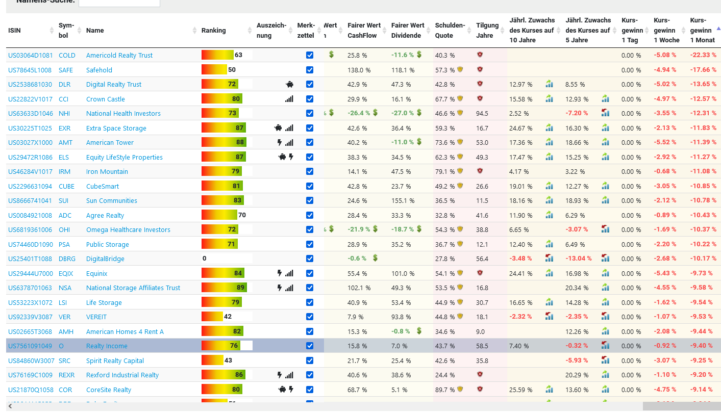 So und zu guter letzt musste ich beim Screenen feststellen (ich habe mir 126 REITS angesehen), dass fast alle (bis auf knapp 1/5tel) in dem letzten Monat Kursverluste eingebußen mussten (siehe Anhang als Beispiel). Der Sektor wird zur Zeit etwas abgestraft.