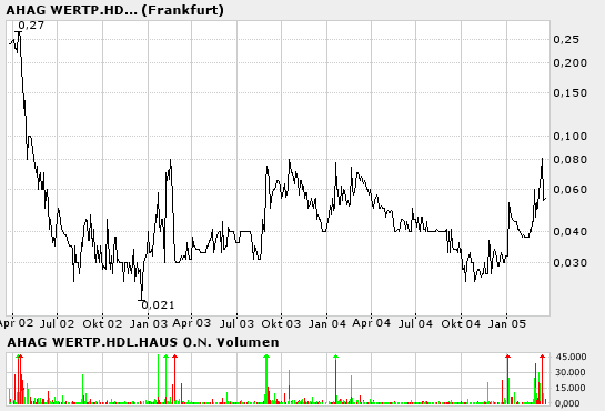Kurshistorie Frankfurt Datum Erster Hoch Tief Letzter Umsatz 21.03.2005 0,054 0,058 0,051 0,056 59.3k 18.03.2005 0,051 0,065 0,050 0,058 160.2k 17.03.2005 0,062 0,062 0,054 0,054 145.0k 16.03.2005 0,072 0,072 0,061 0,064 232.4k 15.03.2005 0,091 0,096 0,062 0,068 722.6k 14.03.2005 0,064 0,088 0,059 0,081 585.1k 11.03.2005 0,065 0,065 0,059 0,059 21.8k 10.03.2005 0,055 0,064 0,050 0,062 308.8k 09.03.2005 0,045 0,064 0,056 0,059 340.6k 08.03.2005 0,045 0,060 0,045 0,060 502.3k 07.03.2005 0,050 0,050 0,049 0,050 100.6k 04.03.2005 0,053 0,053 0,052 0,052 59.0k 03.03.2005 0,048 0,053 0,045 0,053 165.1k 02.03.2005 0,042 0,054 0,042 0,048 301.9k 01.03.2005 0,055 0,055 0,036 0,046 833.6k 28.02.2005 0,046 0,060 0,046 0,060 408.0k 25.02.2005 0,044 0,046 0,039 0,044 93.0k seit märz erhöhtes handelsvolumen, da weiss doch jemand mehr !? |