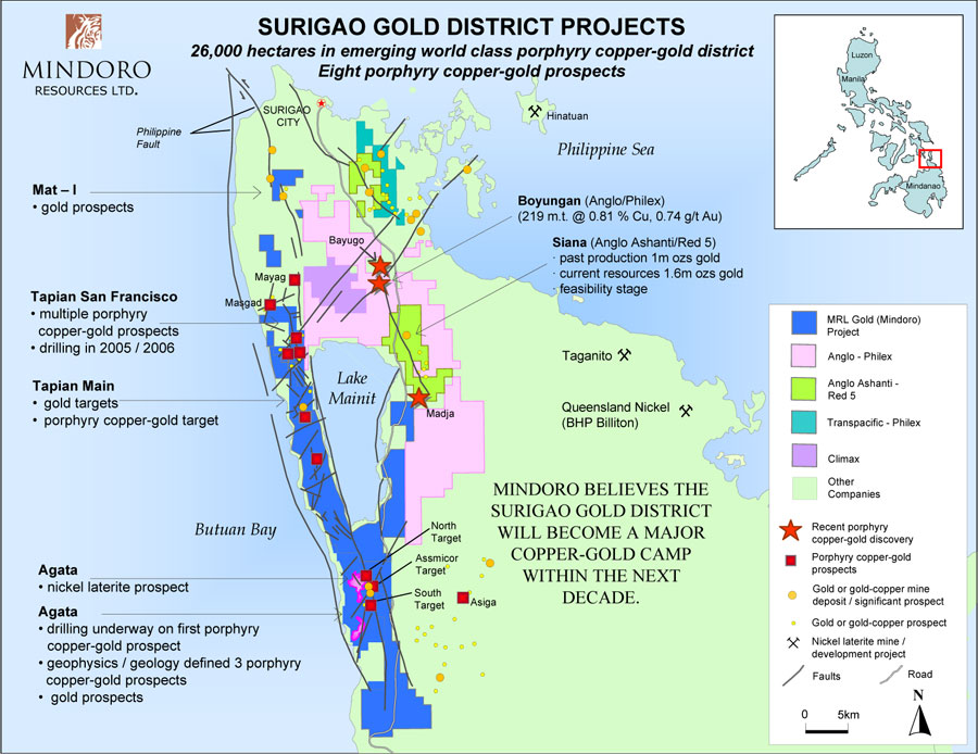 Bei Agata handelt es sich um ein ausgedehntes Mineralisierungszielgebiet mit epithermalen Goldvorkommen und mindestens drei Porphyr-Kupfer-Gold-Prospekten oder Bohrzielen (siehe die Pressemitteilungen von Mindoro vom 5. August 2005 und vom 29. September 2005). Im Porphyr-Kupfer-Gold-Zielgebiet von Agata North werden derzeit Bohrungen vorgenommen. Mit der Entdeckung mehrerer bedeutender Porphyr-Kupfer-Gold-Lagerstätten ist der Surigao Gold District zu einem spannenden und ausgesprochen aktiven Explorationsgebiet geworden, das internationale Beachtung findet. Im Zusammenhang mit den hohen Nickel- und Kobaltpreisen gab es in jüngster Zeit einen starken Aufschwung im Bereich der Nickel-Exploration im Surigao District und auf den Philippinen im Allgemeinen.