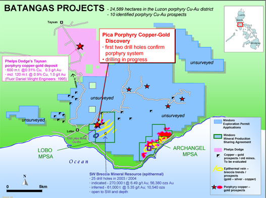 Mindoro is a well-financed Tier 1 Issuer trading on the TSX Venture Exchange (MIO) and the Frankfurt Stock Exchange (OLM). Mindoro has identified 19 porphyry copper-gold prospects and a nickel laterite prospect in the Philippines and is dedicated to pursuing an aggressive strategy of drilling multiple targets in 2005-2006. Recent drilling confirmed the Pica porphyry copper-gold discovery on the Lobo Project, where drilling continues, and drilling is underway on a second porphyry prospect on the Agata Project.