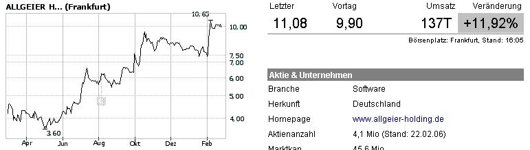 Die börsennotierte Allgeier-Gruppe, ein Konglomerat verschiedener Töchter im IT-Dienstleistungssektor, Personalvermittlung und ERP-, DMS- sowie Security-Software, ist in der Vergangenheit bereits stark durch Zukäufe gewachsen und will weiterhin Zukaufen. Man sei derzeit in Vorverhandlungen mit einem IT-Service-Unternehmen. Der mögliche Übernahmekandidat habe 2005 rund 14,5 Millionen Euro umgesetzt und dabei ein Ebit von voraussichtlich 2 Millionen Euro erzielt. In rund fünf Wochen soll der Kauf perfekt gemacht werden, falls Verhandlungen zu einem positiven Ergebnis kommen.