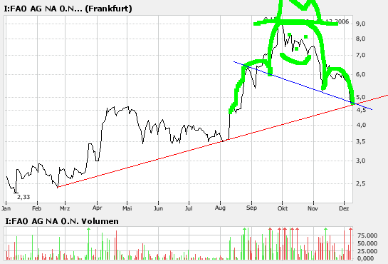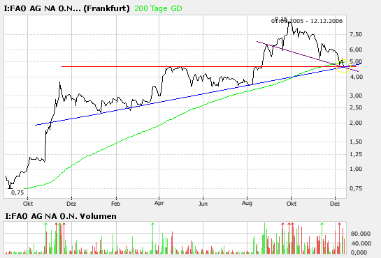 Der Kurs ist zwar am fallen, aber die fundamentalen daten (KGV bei ca. 11 dieses Jahr, KUV von ca 3,5) positives Ergebniss mit Wachstumsaussichten fuer 2007 und auch der Chart (SKS-Formation-nackenlinie und untere Trendkanalbegrenzung liegen heute auf Schlusskurs) "versprechen" ein up. Mal sehen...