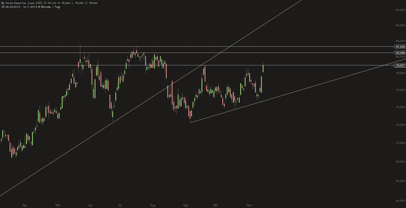 DJ: Home Depot verdient im 1Q mehr als erwartet und hebt Prognose an ATLANTA (Dow Jones)--Die US-Baumarktkette Home Depot hat im ersten Quartal (2. Mai) sowohl Umsatz als auch Ergebnis erhöht und die Erwartung des Marktes übertroffen. Das Nettoergebnis stieg auf 725 Mio USD, verglichen mit 514 Mio USD im Vorjahreszeitraum, wie die Home Depot Inc aus Atlanta am Dienstag mitteilte. Je Aktie verdient der Konzern 0,43 (Vorjahr: 0,30) USD. Ohne Sonderposten lag das Ergebnis bei 0,45 USD. Analysten hatten mit 0,40 USD gerechnet. Die Prognose für das laufende Geschäftsjahr hob das Unternehmen an.