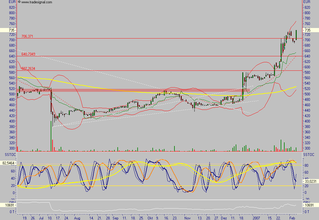 Custodia ist eine Beteiligungsholding mit Sitz in München, ursprünlich aus der Brauerei Löwenbräu erwachsen. Die Custodia Holding hält knapp über 25 % der HOCHTIEF-Anteile, Hochtief hat eine Marktkapitalisierung von über 3,5 Mrd. Euro, Custodia Holding hat eine Marktkapitalisierung von ca. 294 Mio., 540 Mio. wurden aufgenommen, d. h. fremdfinanziert, 300 Mio von Banken, 240 Mio. wurden durch Aufsichtsratsmitglieder zur Verfügung gestellt.. Darüber hinaus besitzt Custodia 3 Gewerbeimmobilien mit einem Leerstand von zuletzt 1,2 %. Ferner hält die Custodia Gold, 67.844 Feinunzen mit einem durchschnittlichen Ankaufspreis von EUR 323 je Unze. Mit anderen Worten ist die Custodia Holding allein durch die Beteiligung an Hochtief aktuell mit 12 % unterbewertet, abgesehen von den Gewerbeimmobilien und Goldreserven, abzüglich den Geschäftsaufwand, ferner ist die Aktie ausgebrochen, bei überwinden des 200 GD und des Widerstandes bei 510/15 sollten rasche Kurse um 580 realistisch sein. |