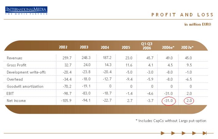 Im vierten Quartal 2006 hat die Internationalmedia Gruppe, im Wesentlichen bedingt durch die Einmalbelastungen der erstmaligen Anwendung von IAS 36 auf das Filmvermögen und der zusätzlichen Korrektur der aktivierten Filmstoffentwicklungskosten, neben einem Gesamtergebnis (Ergebnis nach Steuern) in Höhe von -17,6 Mio. Euro ein operatives Ergebnis (EBIT) in Höhe von -15,1 Mio. Euro hinnehmen müssen.