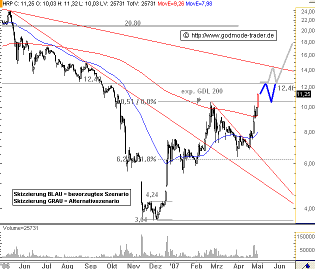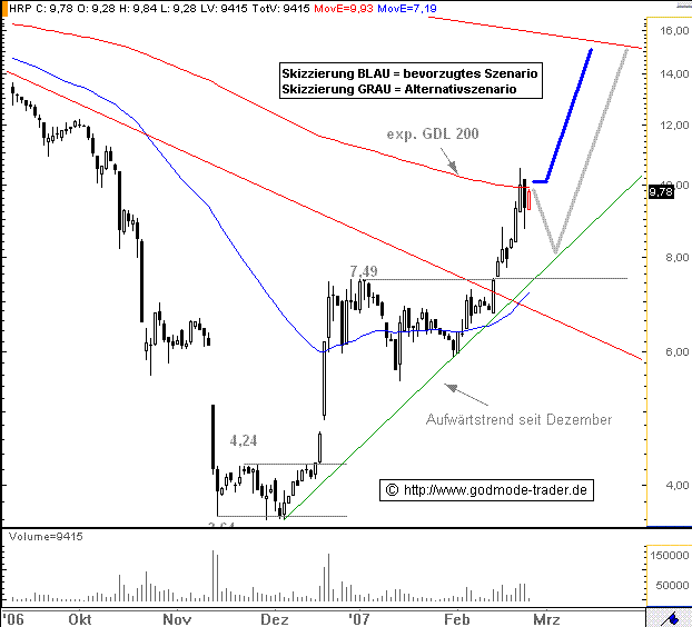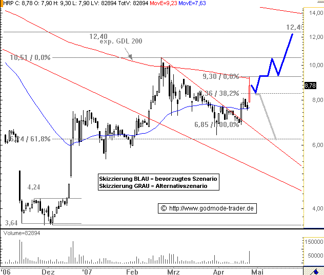 Rückblick: Die REINECKE&POHL Aktie (Nachrichten/Aktienkurs) markierte am 14.11.2006 ein Tief bei 3,64 Euro. Anfang Dezember notierte die Aktie kurzzeitig minimal darunter. Danach startete die Aktie zu einer massiven Aufwärtsbewegung bis auf ein Hoch bei 10,50 Euro. Nach diesem Hoch vom 21.02.2007 konsolidierte die Aktie fast auf das 61,8% Retracement bei 6,24 Euro. Am 19.04.2007 brach die Aktie bereits den kurzfristigen Abwärtstrend. Im gestrigen Handel zog die Aktie noch einmal stark an. Die exp. GDL 200 bei aktuell 9,23 Euro war aber bisher eine zu hohe Hürde.