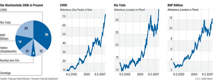 Neben dem brasilianischen Marktführer Companhia Vale do Rio Doce (CVRD) sind dies BHP Billiton und Rio Tinto. Würde BHP Billiton seinen britisch-australischen Rivalen Rio Tinto übernehmen, würde der von Melbourne aus gesteuerte Konzern wie CVRD mehr als ein Drittel des Weltmarktes für Eisenerz kontrollieren. Zwar könnte diese Konzentration in manchen Regionen, vor allem in Asien, Kartellbehörden auf den Plan rufen. Eine unüberwindbare Hürde wäre der hohe Marktanteil aber nicht.