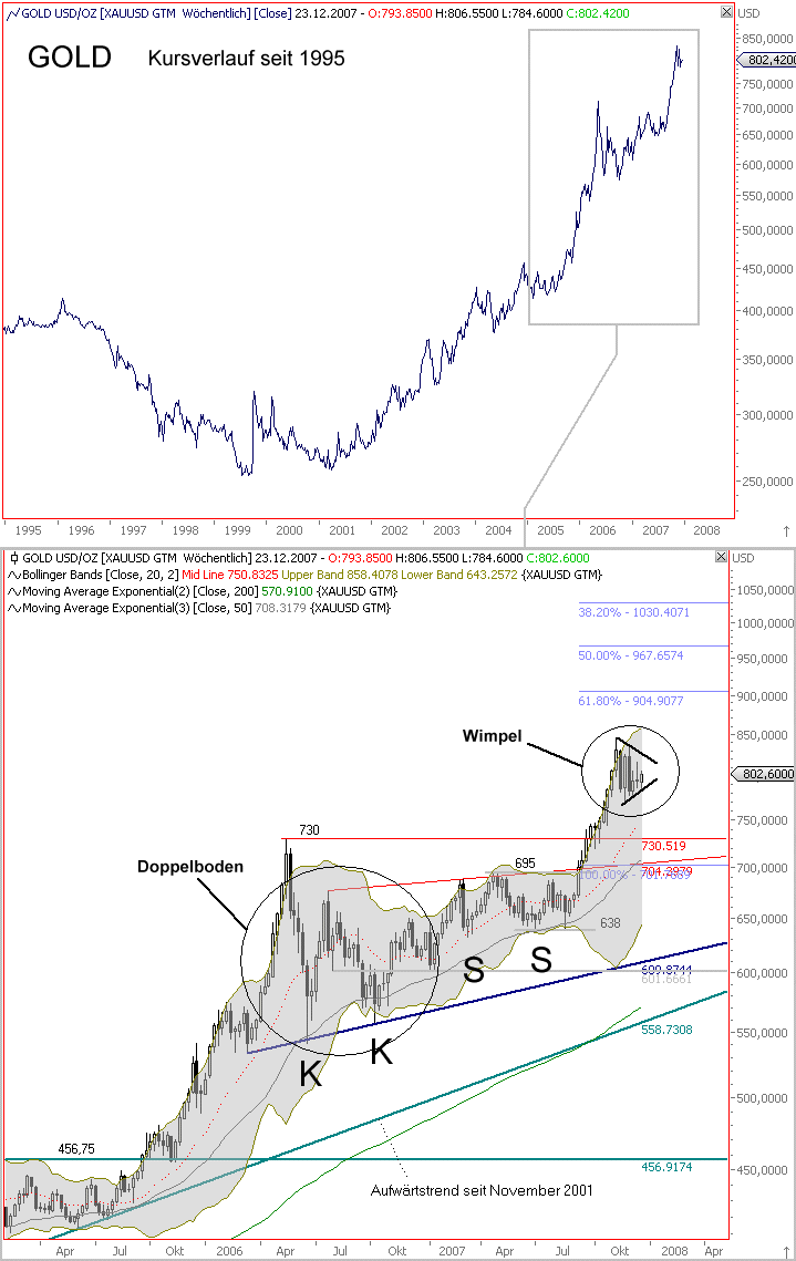 Am 08.11.07 erreichte die erste Ausbruchbewegung bei 845,8 $ das Jahreshoch 2007. Der Kursverlauf seit November zeigt im dargestellten Wochenchartintervall einen Wimpel. Dieser kündigt einen starken Folgeanstieg an.