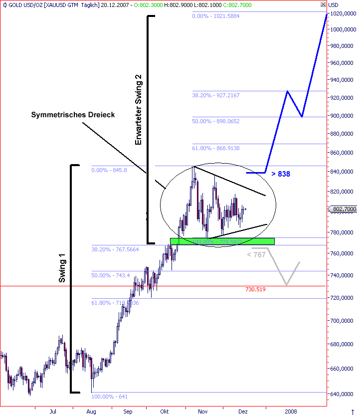 Seit November 2007 konsolidiert der Goldpreis unterhalb des Allzeithochs von 850 $ pro Feinunze. Zwischen 775 $ und 845 $ verläuft diese Konsolidierung und diese Konsolidierung läßt sich mittlerweile gut "lesen". Es handelt sich je nach betrachtetem Chartintervall um einen Wimpel bzw. symmetrisches Dreieck. Diese Formationen kündigen in Bälde die zweite größere Aufwärtsbewegung an.
