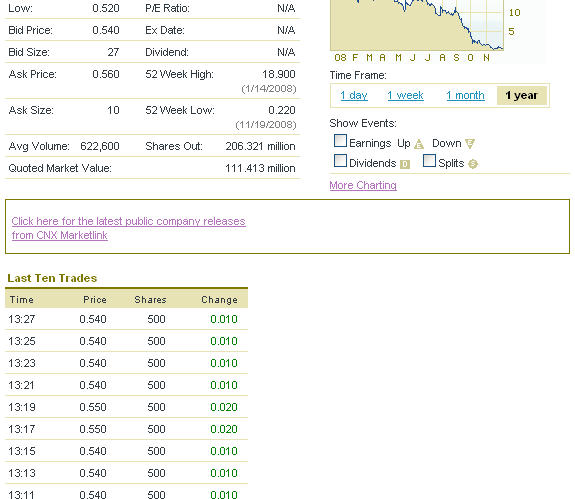 Im August bis Anfang September 2008 war diese Aktie noch bei über 5€ um dann im November auf das Tief von etwa 20 Cent zu fallen. Gibt es hierfür eine Erklärung, denn mit denn mit den Unruhen alleine lässt sich dieses nicht erklären. Die Unruhen waren auch schon da, als die Aktie bei 10 € stand. Die zurückgegangene Rohstoffnachfrage wäre ein weiterer Grund, aber muss deshalb eine Aktie so derartig in den Keller fallen? Und mit einem allgemeinen Rückgang aufgrund fallender Leit-Indizes lässt es sich auch nicht alleine erklären.....