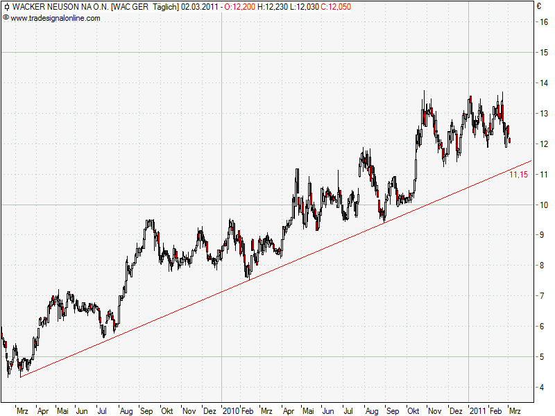der Chart sieht nicht vielversprechend aus. Möglich, daß wir jetzt die langfristige Aufwärtstrendunterstützung bei 11,15 € testen müssen... Im logarithmischen Chartbild liegt diese Unterstützung bei 11,91.