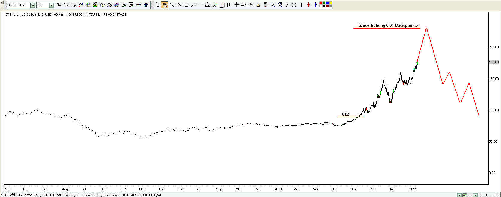 Hier gebe ich Tony Ford recht. Weitere Übertreibungen auf den Rohstoffmärkten hätten fatale Folgen für die gesamte Weltwirtschaft. Zudem wenn das Öl nachgibt, werden auch wieder Kunstfasern interessant und da kann dann meisst der Baumwollpreis nicht mehr wirklich mithalten. Am 4.2. werden die Zahlen veröffentlicht, wie die Anbaulage für Baumwolle aussieht. Indem Fall tippe ich auf "Sell on good News". Die Anbauflächen werden grösser ausfallen, weil viele hier vielleicht noch den netten Gewinn riechen, wenn sie jetzt nochmal Baumwolle anbauen. Dann wird widerum mehr produziert wie gebraucht und die hat zur Folge und unterstützt Tony Fords Aussage. Ein wenig in Wirtschaft aufgepasst und man kann den Preisanstieg wie auch den Abschwung bei den Rohstoffen vorhersehen. Was glaube ich aber zur Unterstützung fehlt sind die höheren Zinsen bei den Geldern, die gerade die Rohstoffmärkte spülen. Wenn das geld mehr kostet, dann wird auch nicht zu viel davon auf dem Markt sein und alle Blasen platzen dann nahezu gleichzeitig, da alle ihre Kohlen aus dem noch heissen Feuer rausholen. Daher eine Verdopplung in 2011, obwohl der Baumwollkurs eine Vervierfachung hinter sich hat, halte ich für sehr unwahrscheinlich. Grüsse $unny |