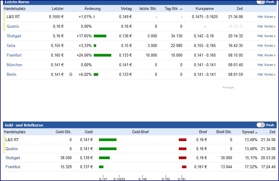 Zurück zu den Kursen,.. ich versuche immer möglichst gleichzeitig (sofern zeitlich und technisch realisierbar) die Bid/Ask Kurse an den ausl. Handelsplätzen (z.b. TSX), die Kurse an den deutschen Börsenplätzen, sowie zusätzlich den aktuellen Kurs von L&S auf Ariva und abschliessend den mir angezeigten "Quote-Kauf" Kurs auf Wikifolio zu prüfen/analysieren.
