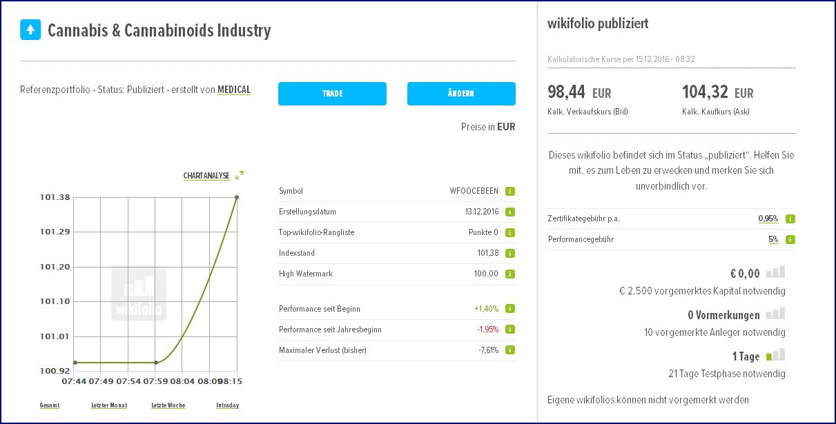 Das "Cannabis & Cannabinoids Industry" - Wikifolio wird mein zweites und vermutlich letztes Wikifolio und ist als **hochspekulativ* zu werten! Die Cashquote wird künftig bei max. 5% liegen. Es werdens höchstens 5 Aktienpositionen aufgenommen. Verluste sind aber jederzeit mögich und von vornherein nicht ausgeschlossen! Investieren Sie nicht und merken Sie sich nicht vor, wenn das beabsichtigte Anlagegeschäft der sicheren Geldanlage dienen soll! Die angedachte Investition sollte unter Berücksichtigung Ihrer persönlichen Verhältnisse erfolgen. Eine Investiton in ein Zertifikat des "Cannabis & Cannabinoids Industry" - Wikifolio ist nach meinem Verständnis der Risikoklasse E (E = Totalverlust möglich // https://de.wikipedia.org/wiki/Risikoklasse) zuzuordnen. Sind innerhalb der üblichen 21 Tage Wartefrist die notwendigen Vormerkungen erreicht werde ich die Verifizierung bis spätestens Mitte Januar 2017 vollziehen und bemüht sein das Zertifikat zeitnah in den Handel zu bringen. Es werden künftig keine weiteren Kommentare veröffentlicht! Eine Investition in ein Zertifikat des "Cannabis & Cannabinoids Industry" - Wikifolio kann einen Totalverlust Ihres eingesetzen Kapitals zur Folge haben! Wichtiger Hinweis: Die im "Cannabis & Cannabinoids Industry" - Wikifolio gehaltenen Wertpapiere und, oder Aktien werden ausschliesslich durch meine persönliche, subjektive Meinung ausgewählt. Ich übernehme keinerlei Haftung für finanzielle Verluste, Irrtümer sind vorbehalten! Börsengeschäfte, besonders Termingeschäfte, beinhalten Risiken, die zu einem Totalverlust des eingesetzten Kapitals und darüber hinaus führen können! Alle Angaben und Quellen werden sorgfältig recherchiert. Für die Richtigkeit sämtlicher Inhalte, sowie der daraus resultierenden Anlageentscheidungen wird jedoch keine Garantie übernommen. Ich behalte mir trotz größter Sorgfalt einen Irrtum insbesondere in Bezug auf Zahlenangaben und Kurse ausdrücklich vor. Die enthaltenen Informationen stammen aus Quellen, die für zuverlässig erachtet werden, erheben jedoch keineswegs den Anspruch auf Richtigkeit und Vollständigkeit. Die hier im "Cannabis & Cannabinoids Industry" - Wikifolio wiedergegebene /nachgebildete/gehandelte subjektive Meinung stellt keine Gewinn- und, oder Erfolgsgarantie dar, weder explizit noch implizit ist sie als Zusicherung etwaiger Kursentwicklungen zu verstehen. Ich schließe jede Haftung diesbezüglich aus. Angabe gemäß der Lizenzvereinbarung für Veröffentlichungen von Musterdepots auf wikifolio.com: "Sollte der Lizenzgeber Finanzinstrumente, die im wikifolio-Musterdepot enthalten sind oder sein können, selbst handeln oder beabsichtigen zu handeln, hat er dies gegenüber der Gesellschaft unverzüglich bekanntzugeben und auf wikifolio.com zu veröffentlichen." - Das habe ich hiermit getan.