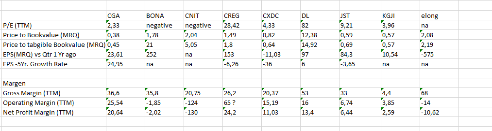 CGA ist auf Net Assetts Basis und KGV die günstigste. CXDC ist ebenfalls sehr günstig und wächst stärker, allerdings Insider halten 60%