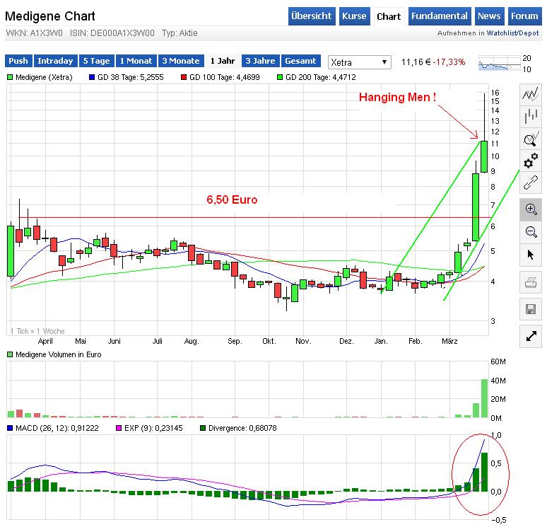 laufen gebracht werden und schon kommen die Glücksritter. Meisstens sind die Initatoren bei hohen Umsätze schnell wieder raus, wobei dabei eben viele viele viele Glücksritter wieder auf der Strecke bleiben und sich dann anschliessend Wundenleckend wundern. Meisst Wissen sie garnicht welches Spiel mit ihnen gespielt wurde. ES sollte sich jeder die Frage stellen: Welche Fackten standen dahinter oder wie Werthaltig diese waren. Bei Medigene standen keine bewegende Fakten dahinter. Ist meine Meinung. Freue mich Immer solche situationen zum shorten auszunutzen. Habe 3 mal Progressiv geschortet, mit Ziel ca. 3,80-4,20 €. Wenn ich solche Werbungen wie die der Geissens betrachte, die sicher auch fruchten bei den vielen Dumofbacken in Deutschland, dann wundert mich garnichts mehr.