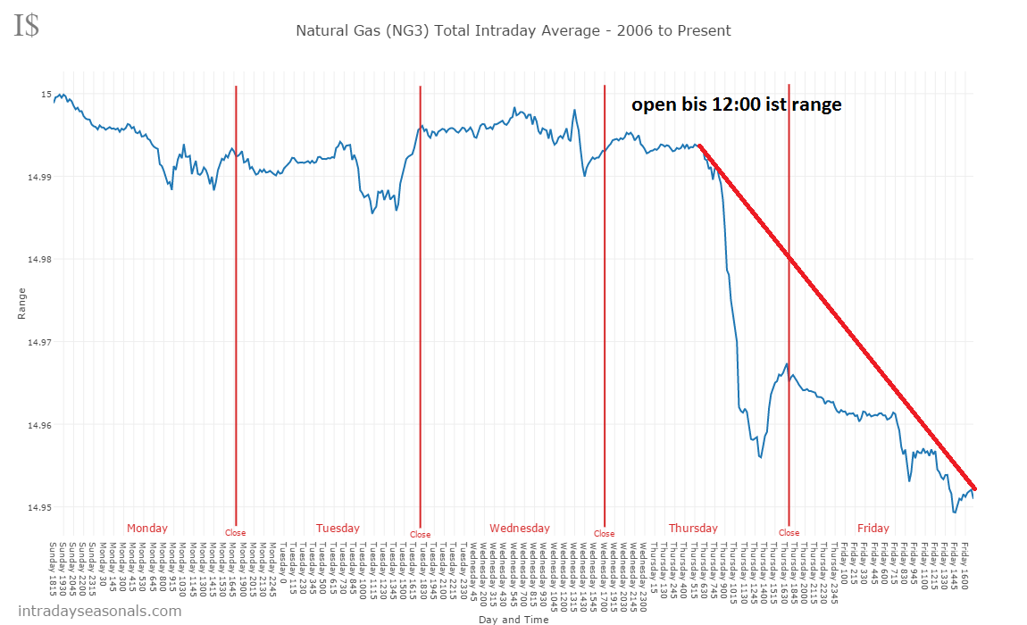 Es schein als ob an einem Donnerstag so gegen Mittag MEZ starker Verkaufsdruck im Natgas besteht. Am Ende des Tages gibts eine leicht Erholung, welche wieder am Freitag abverkauft wird