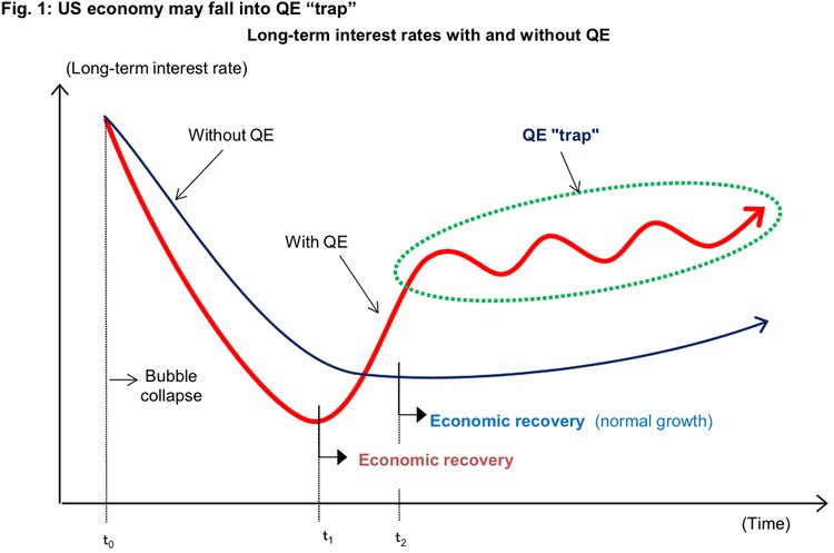 The QE "trap" happens when the central bank has purchased long-term government bonds as part of quantitative easing. Initially, long-term interest rates fall much more than they would in a country without such a policy, which means the subsequent economic recovery comes sooner (t1). But as the economy picks up, long-term rates rise sharply as local bond market participants fear the central bank will have to mop up all the excess reserves by unloading its holdings of long-term bonds.