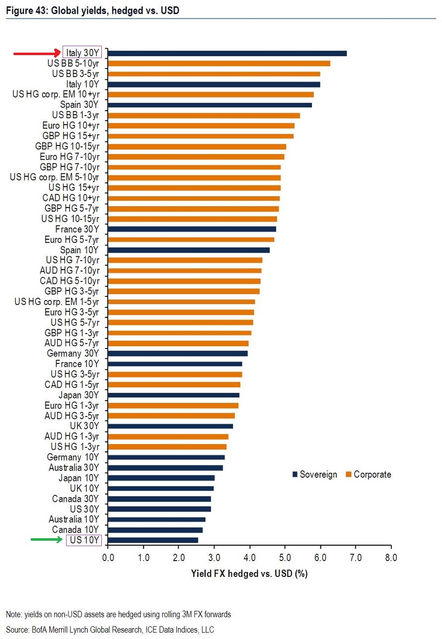 Der Chart unten ist ein aktueller internationaler Vergleich von Bond-Renditen (staatlich und von Firmen). Die niedrigste Rendite bringen erstaunlicherweise 10j-US-Staatsanleihen (ca. 2,6 %). Die dunkelrote Laterne dieser Tabelle bilden 30j-italienische Staatsanleihen mit über 6 %. (im Chart oben)