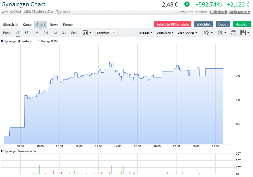 Der Aktienpreis von Synergain ist am Montag dieser Woche zwar regelrecht explodiert, die Marktkapitalisierung ist aber mit rund 300 Mio immer noch moderat oder gar lächerlich gering, wenn man diese mit den positiven Folgen einer wirklich guten Therapie gegensetzt oder der weltweiten Nachfrage nach einem solchen Medikament.