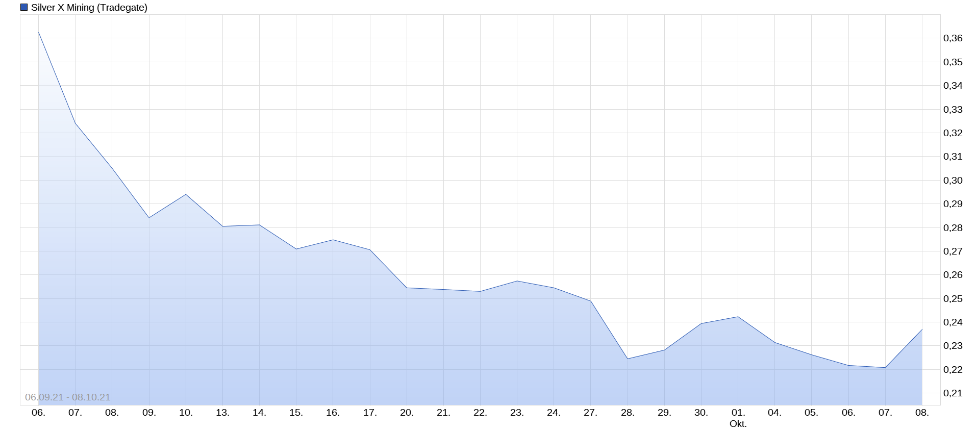 AKTUELL wieder leicht runter auf 23,90$.Für Silver X Mining könnte es wieder in den Bereich von 0,42 CAD gehen.