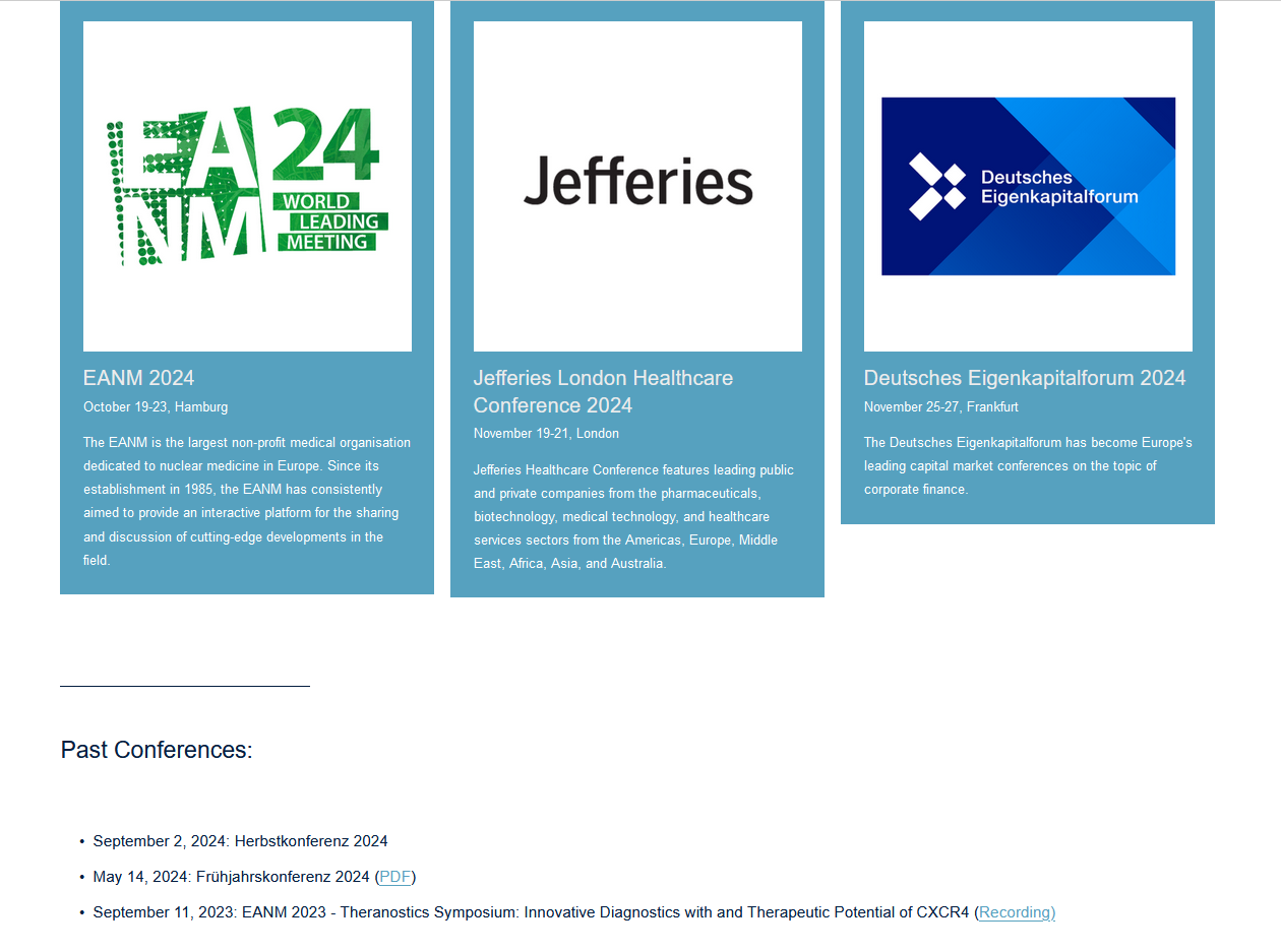 " Mit PentixaFor, einem Gallium-68-basierten Begleitdiagnostikum haben wir in Europa eine Phase III-Registrierungsstudie in Marginalzonenlymphomen gestartet. Mit unserem Therapeutikum PentixaTher, Yttrium-90-basiert gegen Non-Hodgkin-Lymphome (NHL), hat die Dosisfindungsstudie in Phase I/IIa ebenfalls in Europa begonnen. Und noch wichtiger: auch die FDA hat signalisiert, dass wir alles zusammen haben, um sofort eine Phase III in der Indikation Bluthochdruck zu starten."