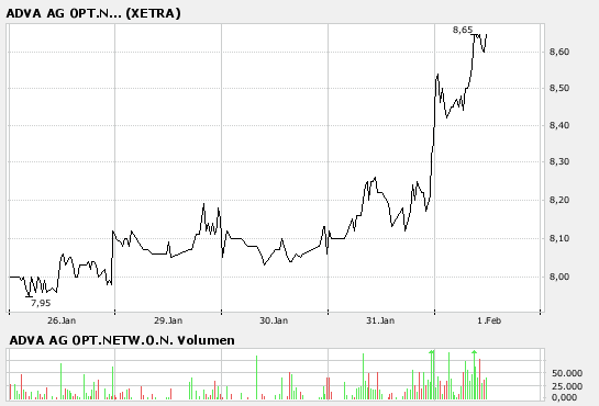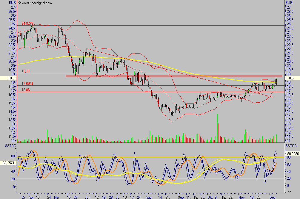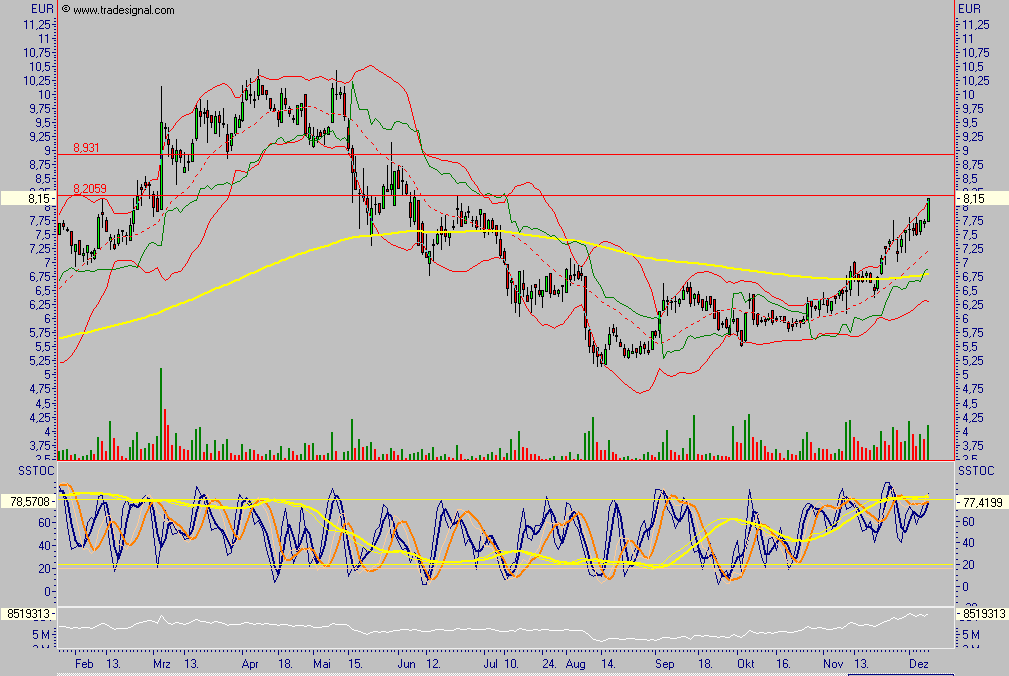 | sehen, wie Geld in die Aktie reinfließt (OBV), auch sieht man, daß die Indikatoren eher quer laufen und die Aktie quasi hochgetragen wird, obwohl ich gestern eher eine Korrektur erwartet hätten (diese stützte sich allerdings auf den Wochenchart, der sehr träge ist. Der nächste, kleinere Widerstand ist jetzt im Bereich 8,20, aber bevor der steile Aufwärtstrend nicht bricht, wird sie wohl weiter getragen werden, der Wochenchart signalisiert allerdings im kürzeren Bereich nach wie vor Überkauftheit, der Tageschart hätte im kurzen Bereich noch etwas Luft. Den Wochenchart füge ich im nächsten Posting bei, hier der Tageschart. |