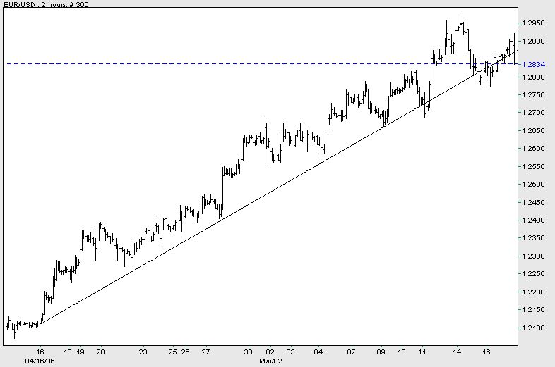Der Euro fällt jedoch nach kurzer Erholung weiter. Das ist Charttechnik pur. In Erwartung der schlechten Daten ist die Zahl der Euro-Long-Positionen im Future-Markt auf einem 10-Jahres-Hoch (s. Posting 15). Da alle schon vorher gekauft hatten, gibt es jetzt nur noch wenige, die den Euro durch Nachkäufe hochtreiben könnten. Dies unterlassen sie auch deshalb, weil der Euro charttechnisch angeschlagen ist: Heute fiel er vom 1-Jahres-Hoch bei 1,2970 (frühmorgens im Asien-Handel) auf jetzt 1,2795 - fast zwei "big figures". Ein solches Chartbild ist ein bärischer "Key reversal" (auf SK-Basis).