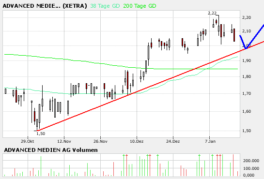 Ich denke auch, das wir diese Woche noch die 2,20€ nachhaltig knacken werden und diesen Monat die 2,40 erreichen. Bei 2,50 werden die ersten "Schnäppchenjäger" Ihre Gewinne realisieren! (ich bin seit 0,98 drin ;-) ). Also da werden Sie Aktien zurück kaufen können. Ich denke das der Tagesumsatz sich stark verändern wird. Viele hoffen, das Sie ihre Aktien gut an ADV zurück verkaufen können.